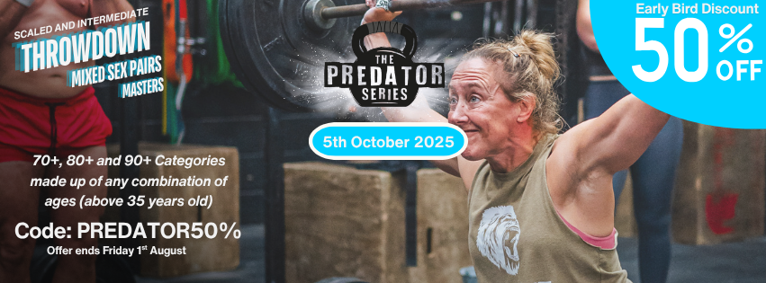 The Predator Series Masters Mixed Sex Pairs Throwdown is a special CrossFit competition hosted at CrossFit Cheltenham for seasoned athletes aged 35 and over, taking place on 5th October 2025. Teams are made up of one male and one female athlete whose ages add up to fit into the combined-age categories of 70+, 80+, or 90+. Each pair will tackle three workouts (WODs) designed to challenge their strength, endurance, teamwork, and strategy—scaled appropriately for Masters athletes. This fun and inclusive event celebrates lifelong fitness, camaraderie, and healthy competition, with separate leaderboards and podiums for each age group. It’s the perfect opportunity for Masters athletes to test their limits, work together, and enjoy the Predator Series atmosphere!